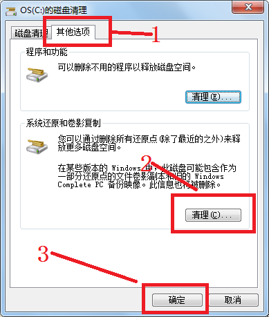 2、在出现如下信息框后,点击选项卡【其他选项】,点击下面的【系统还原和卷影复制】区域的【清理】按钮。接下来系统会询问你“你确定要删除所有还原点(除最近的除外)吗?”,点击【删除】按钮。