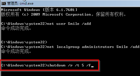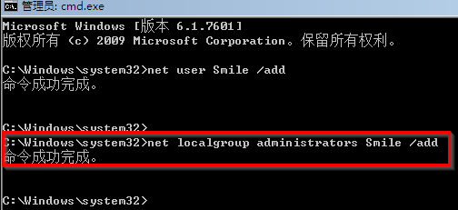 3、接着,在窗口中输入net localgroup administrators Smile /add,完成了升级管理员的操作。
