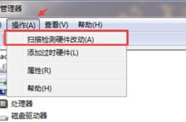 2、点击“操作”,选择“扫描检测硬件改动”。