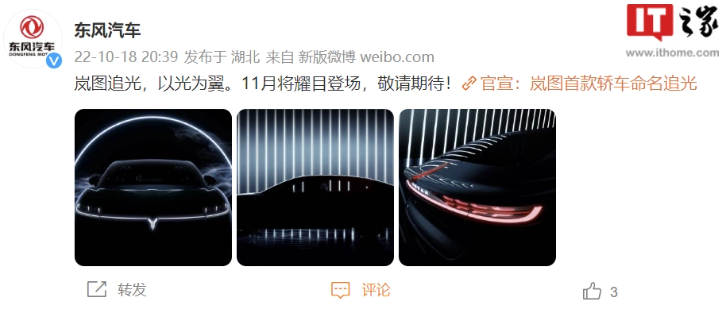 东风旗下岚图首款轿车定名“追光”:封闭式格栅 + 贯穿式 LED 尾灯