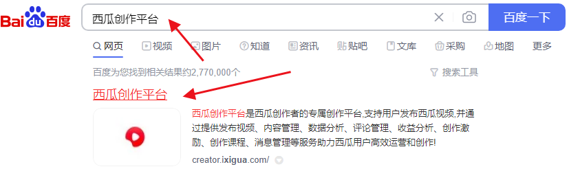 1、通过浏览器搜索框输入“西瓜创作平台”找到图中的标题点击即可进入,也可使用上方的网址直接访问。
