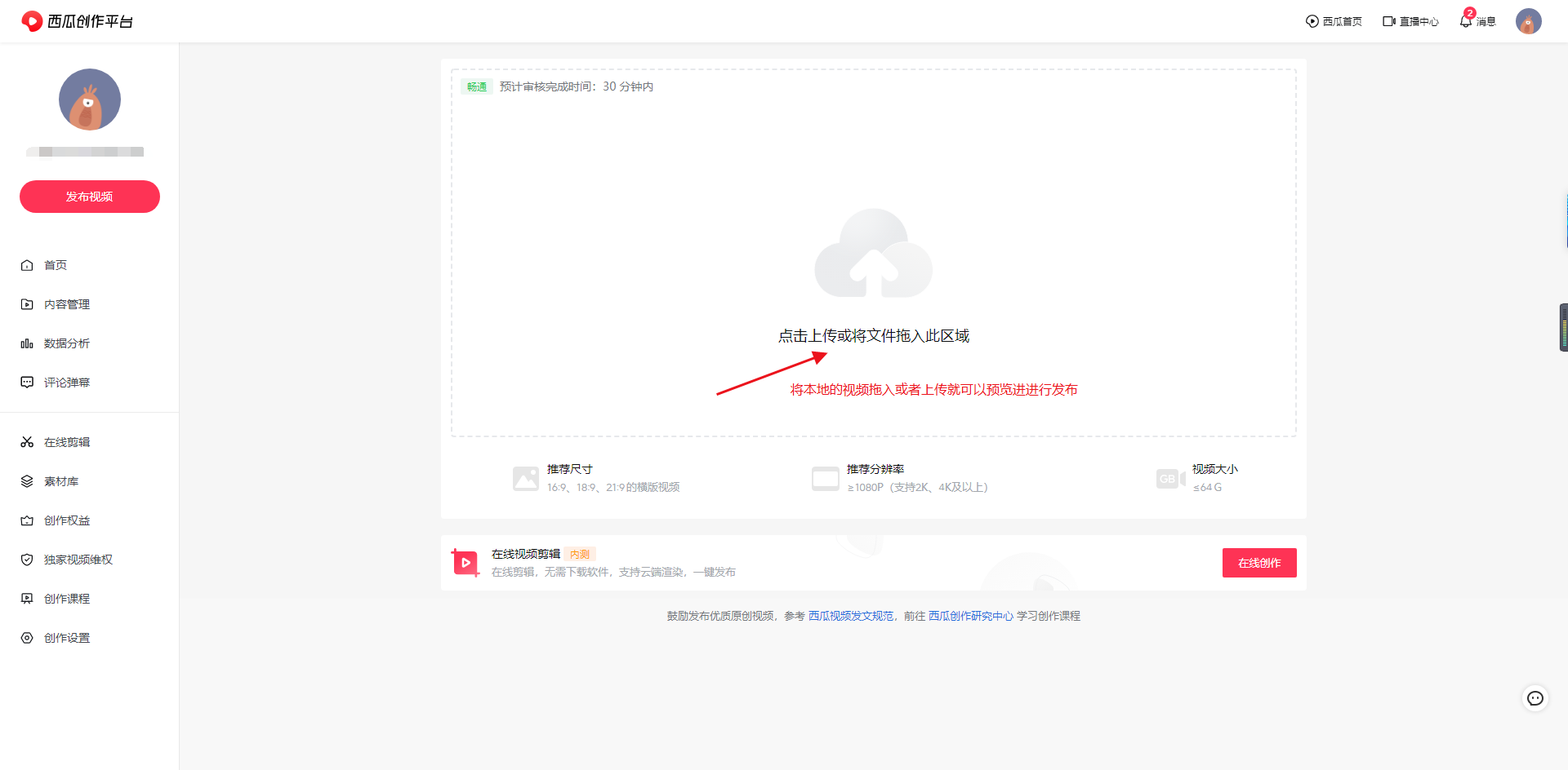 5、进入视频发布页面,将本地的视频文件拖入或者是上传,预览后无误就能发布,审核通过即为发布成功。