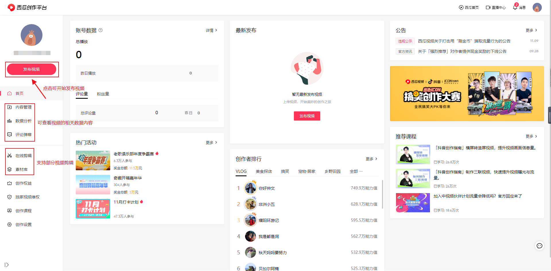 4、登录后即可开始使用,左侧可点击发布视频,还能查看数据,也支持简单的视频剪辑,有素材可直接使用。