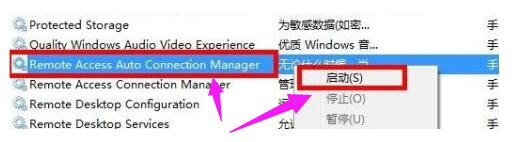8、然后在右边的窗口中找到Remote Access Auto Connection ManagerRemote,右键点击,选择启动。