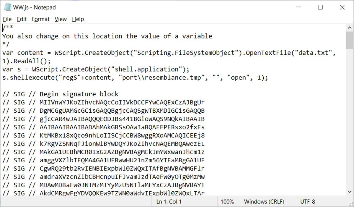通过利用这个漏洞,JS 文件(或其它类型的文件)可以使用嵌入式 base64 编码的签名块进行签名。之后用户打开这些恶意软件,并没有被微软 SmartScreen 标记并显示 MoTW 安全警告,而是自动允许该程序运行。