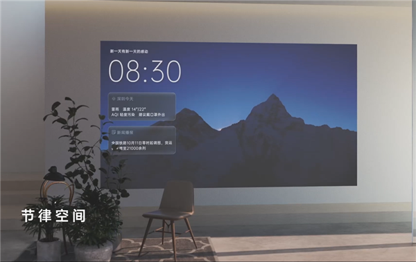 首页客厅,支持快速获取高频功能和个性化服务,智能推荐电影、音乐和智慧场景,同时纯净首页,与现实家居空间自然融合。