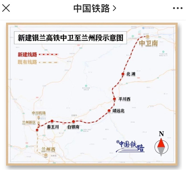 IT之家了解到,今天即将开通运营的银兰高铁中卫至兰州段于 12 月 3 日全线铺轨完成,12 月 15 日开始试运行。线路全长 219 公里,设计时速 250 公里,全线共设中卫南、北滩、平川西、靖远北、白银南、秦王川、兰州西 7 座车站,其中中卫南、兰州西站为既有车站,其他为新建车站。