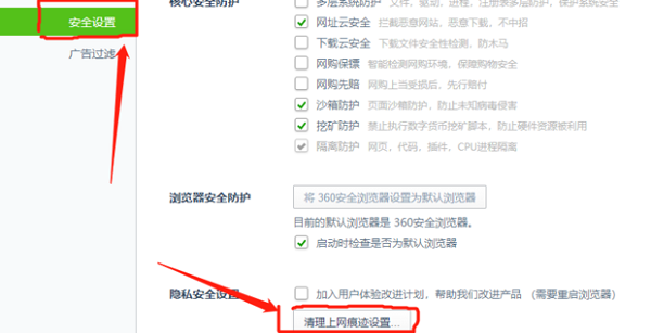 2、进入选项后,点击“安全设置”后进入高级设置中,然后找到“清理上网痕迹设置”并点击打开清理上网痕迹。