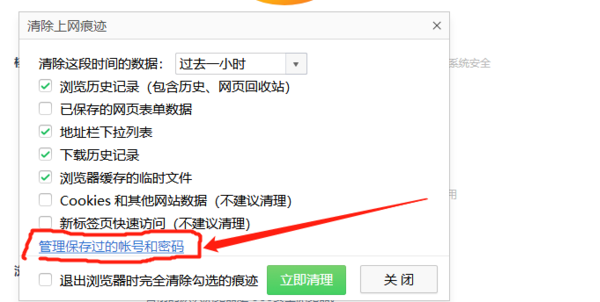 3、在清理上网痕迹小窗口中可以看到蓝色字“管理保存过的账号密码”,并点击打开,进入密码管理。