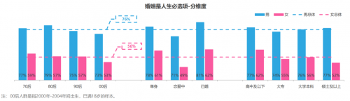 虽然目前社会单身人群,对于结婚这件事都感觉“不着急”,但是从对于婚姻的认知问题上,男性明显比女性更加重视和在意。《报告》显示,受访人群中76%的男性认同“婚姻是人生必选项”,明显高于女性的56%。值得注意的是,女性随着学历的增加,对于“婚姻是人生必选项”的认同度明显降低。由此可见,随着社会进步,女性的受教育程度和自我经济实力的提升,她们的自主意识越来越强,对于男性和婚姻的依赖度越来越低。