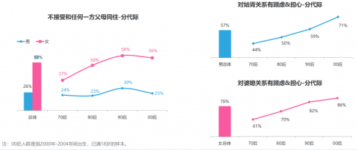 同样,在“婚后家庭职责分配”和“不接受与对方父母同住”的问题上,女性受访者们也显示出了更加自信和独立的意识。