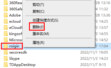 3、然后再文件夹中,找到“roigin”文件夹,将里面的文件全部删除,最后关闭窗口,在运行平台就好了。