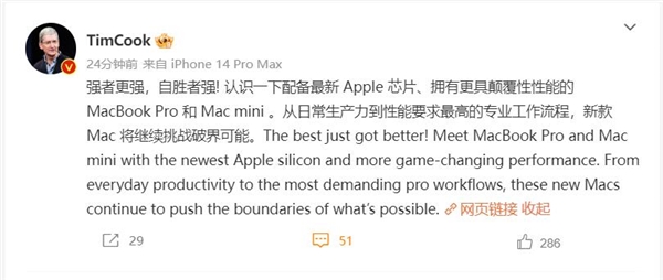 苹果CEO库克表示,MacBook Pro和Mac mini配备最新Apple芯片,拥有更具颠覆性性能。从日常生产力到性能要求最高的专业工作流程,新款Mac将继续挑战破界可能。