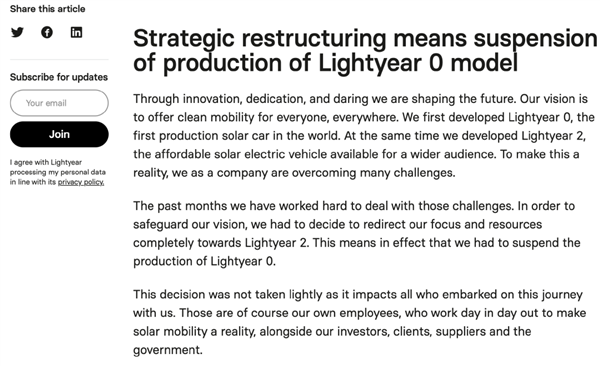 Lightyear 0 刚投产不到三个月就停产,也暴露了太阳能汽车企业关键问题:没钱。