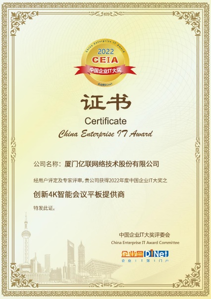 2023年1月3日,由政企市场专业媒体企业网D1Net、信众智(CIO智力输出及共享平台)和中国企业数字化联盟共同组织的 “2022CEIA中国企业IT大奖”重磅发布。亿联网络凭借行业领先的技术和专业的产品及服务,斩获2022年度「政企视频会议领军企业奖」、「创新4K智能会议平板提供商」两项殊荣。