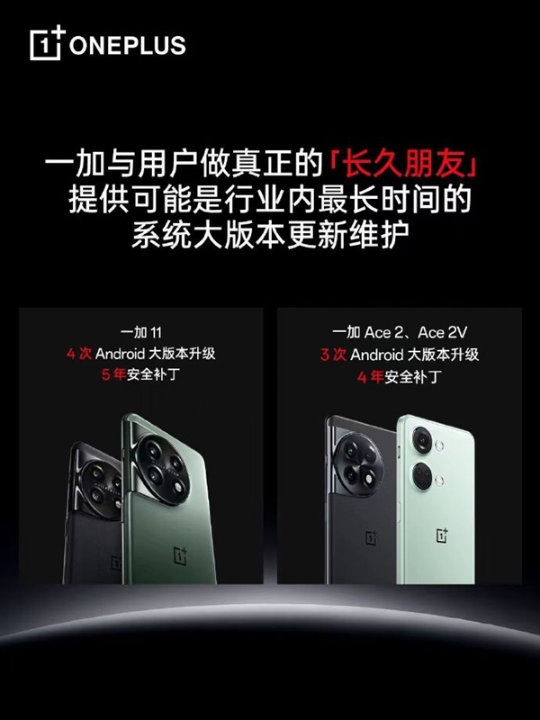据本站了解,一加11、一加Ace2以及一加Ace2V的用户将享有最长时间的软件版本维护更新,其中一加11将会进行4次大版本升级和5年的安全补丁推送,而一加Ace2和一加Ace2V则将进行3次大版本升级和4年的安全补丁推送。