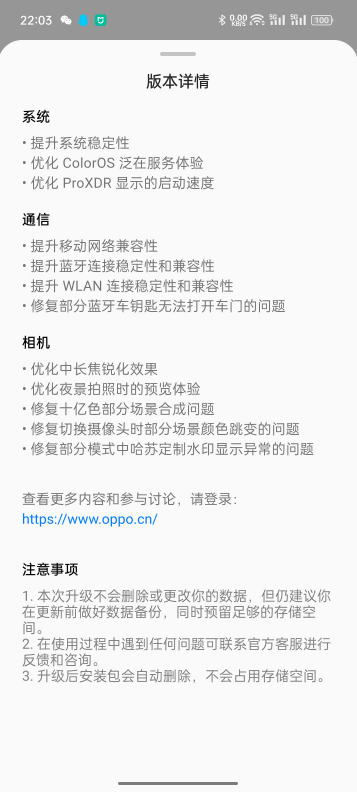 在系统方面,此次更新提升了系统的稳定性,并对ColorOS泛在服务体验进行了优化。此外,还优化了ProXDR显示的启动速度和通信。
