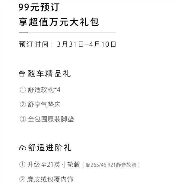 【本站】4月8日消息,魏牌新能源旗下全新旗舰大六座SUV车型蓝山将于4月13日上市。据魏牌新能源官方消息,该车已经开启预售,用户支付99元可享受万元大礼包(3月31日-4月10日)。大礼包包括随车精品礼和舒适进阶礼,其中包括软枕、气垫床、全包围原装脚垫、升级至21英寸轮毂、配合静音轮胎、麂皮绒包覆内饰。