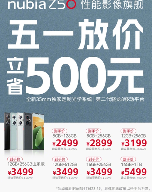 努比亚官方今日宣布,努比亚Z50将在五一假期期间推出限时降价活动,全版本降价500元,到手价为2499元起。据本站了解,该机配备6.67英寸双曲面OLED屏、5000mAh电池、80W快充,以及第二代骁龙8+LPDDR 5X+UFS 4.0性能满血三件套。其6400万像素主摄还配备35mm定制光学系统,拍照速度提升30%,成片率提升20%。