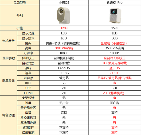 分享一张小明Q3投影仪和哈趣K1 Pro投影仪参数对图,能更清楚看出不同。