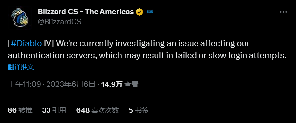 在早上 11 点,暴雪在推特上表示,开发团队目前“正在调查一个问题”,该问题导致“尝试登陆失败或缓慢”。