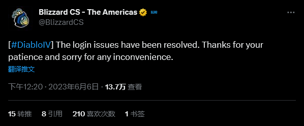 在一个小时以后,暴雪团队发布更新称:“登陆问题已经得到解决。感谢各位的耐心,对于造成的不便我们深表歉意。”