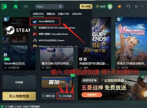 由于steam的服务器距离我们太远,影响了数据接收,导致国内玩家在使用steam之前都需要先打开游戏加速器来改善网络环境。打开迅游加速器,加速steam商店,然后点击启动游戏,即可快速访问steam进行账号注册。迅游加速Steam是免费的,大家依旧可以在口令兑换处输入白嫖迅游加速,得5天加速时长。
