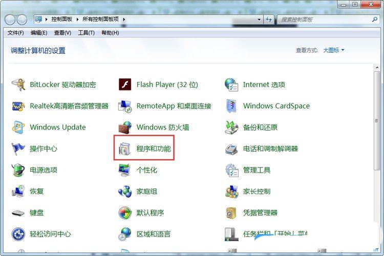 2、控制面板窗口,切换到【大图标】查看方式,找到并点击调整计算机的设置下的【程序和功能】。
