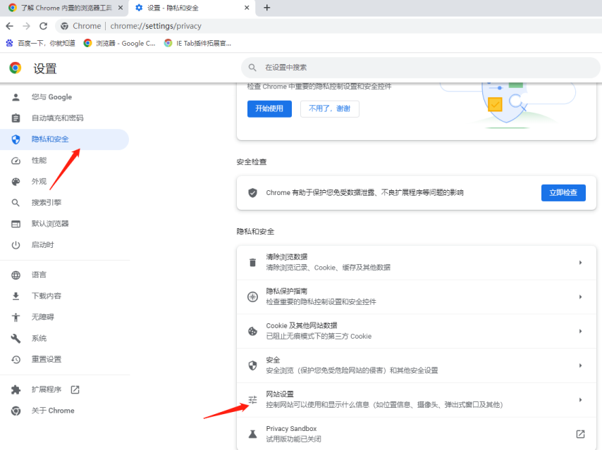 2、进入设置界面后再左侧选择【隐私设置和安全性】,然后在右侧点击【网站设置】(如图所示)。