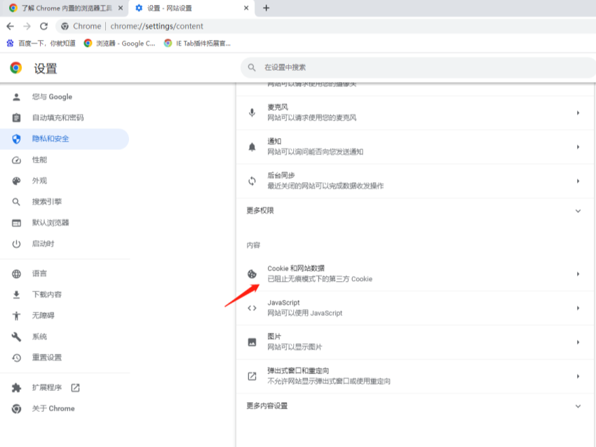 3、进入网站设置界面后,点击【Cookie和网站数据】(如图所示)。