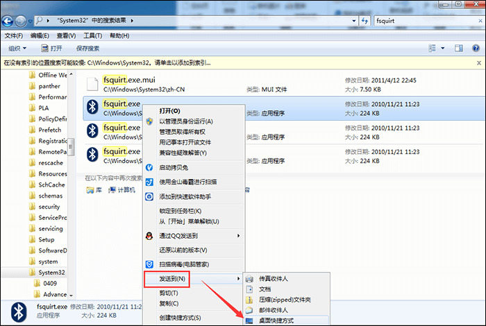 2、然后在弹出页面中输入“fsquirt”,在system32中找到应用程序fsquirt.exe。接着将光标移动到fsquirt.exe应用程序上,然后鼠标右击。点击“发送到”选择桌面快捷方式就可以了。