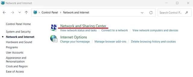 2、前往“网络和 Internet - 网络和共享中心”。