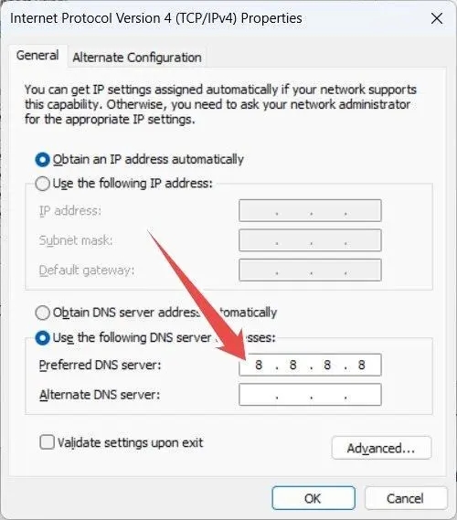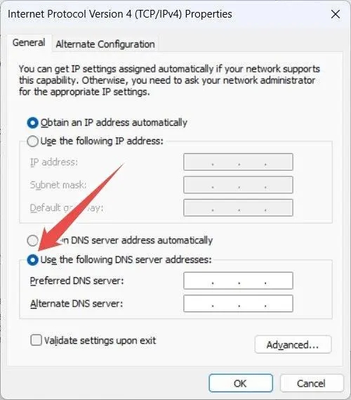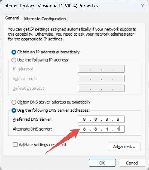 7、如果错误仍然出现,请尝试使用 Google 的 DNS。返回到 Internet 协议版本 4 (TCP/IPv4) 窗口,然后选择“使用以下 DNS 服务器地址”单选按钮。