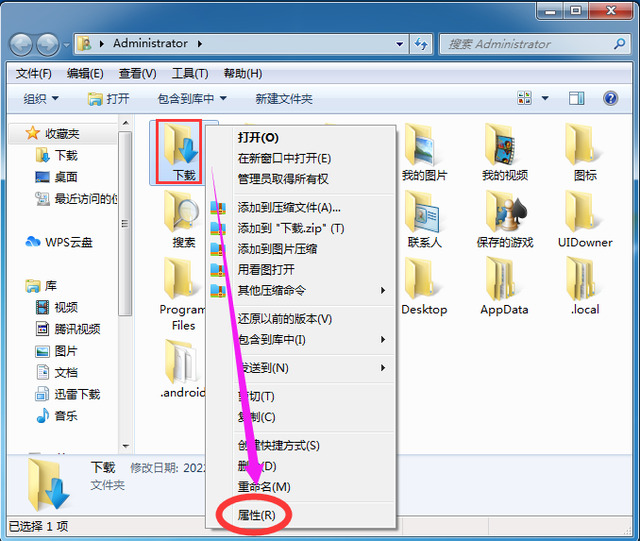 2、然后在打开的窗口里面,右键点击“下载”文件夹,在弹出的菜单中点击“属性”选项。