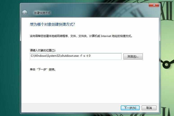 2、 输入‘C:\Windows\System32\shutdown.exe -f -s -t 0’,点击‘下一步’。