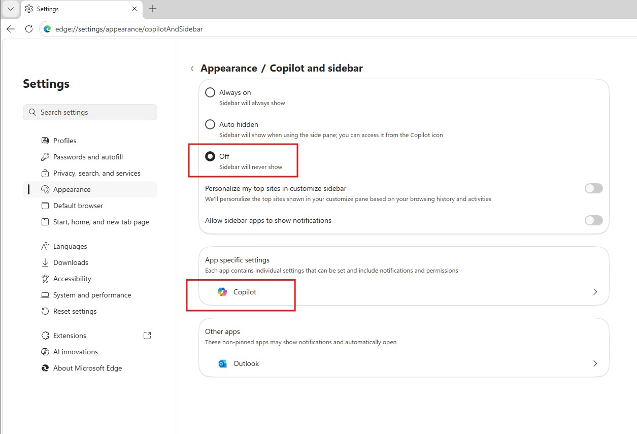 2. 在左侧菜单中选择“外观”,向下滚动页面,选择“Copilot 侧边栏”。