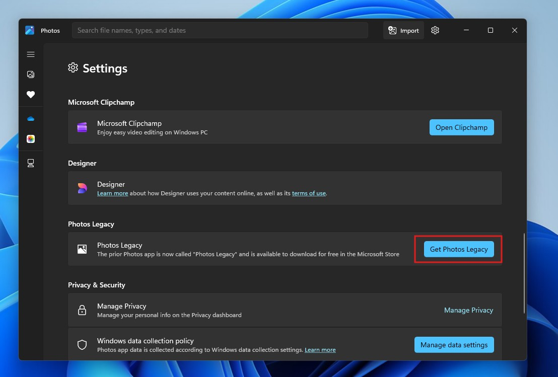 3. 向下滚动页面,点击“获取照片(旧版)”按钮。