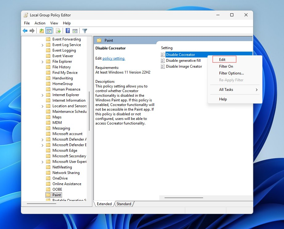 4. 在右侧设置选项卡下,右键单击“Disable Cocreator”并选择“编辑”。