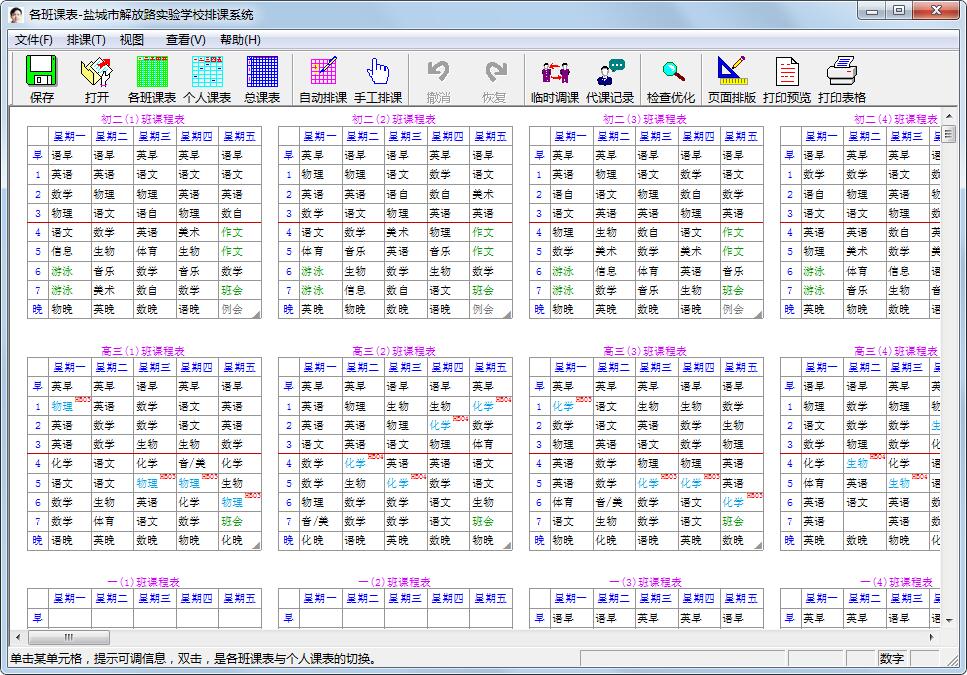 2.数据输入完毕后保存、关闭“排课工作簿.xls”,运行本软件“排课系统.exe”,执行菜单【排课】→【导入所有数据】;