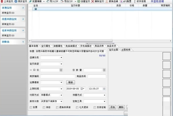 1、工具栏:导入和导出CSV、上传宝贝、删除宝贝、更换店铺、API配置(应用订购和授权);