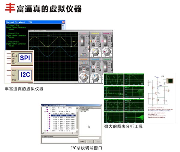 4、 丰富的虚拟仪器:13种虚拟仪器,面板操作逼真,如示波器、逻辑分析仪、信号发生器、直流电压/电流表、交流电压/电流表、数字图案发生器、频率计/计数器、逻辑探头、虚拟终端、SPI调试器、I2C调试器等;