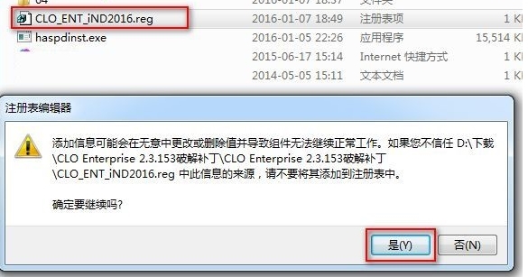 3、用户在破解补丁文件夹中运行CLO_ENT_iND2016.reg的文件,弹出如下的注册表编辑器后,我们点击是按钮。