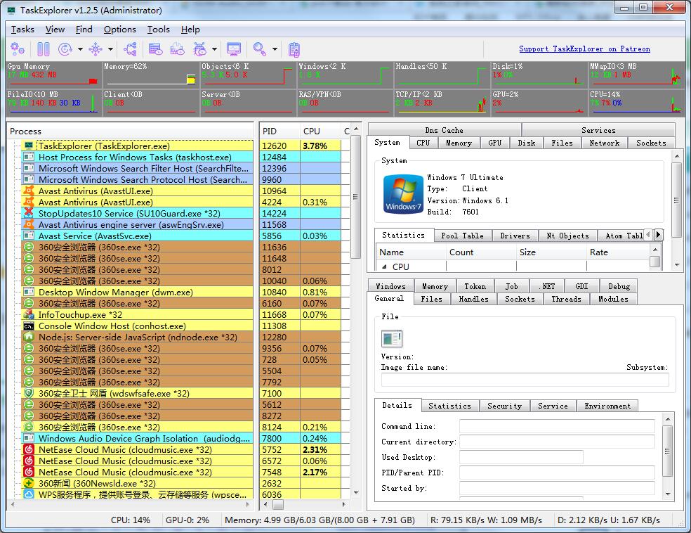 TaskExplorer是一款可以帮助用户在软件界面快速查看自己的电脑后台任务的高级任务管理器,也可以在软件查看系统信息,查看内存数据,查看CPU数据,查看网络读写性能,让用户对当前电脑的基本运行状态更了解,软件将所有信息显示在主界面,打开软件就可以自动获取当前计算机的各项数据。