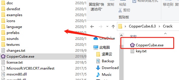 6、通过快捷方式右键中的打开文件所在位置可以进入到安装目录下载,将crack文件夹中的【CopperCube.exe】复制至目录下替换;
