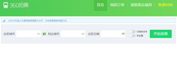 春运期间会产生大量票务订单,订单排队处理让不少网民吃到了苦头,经常是眼看着到手的票因订单未及时排队而耽搁,订单被迫等待处理,一等就是十分钟以上。而且在未知的等待时间变数颇多,一时疏忽便错失良机。360抢票王可自动为用户排队,当用户填写好订单信息,自动加入队列,一旦排队成功便弹出提示提醒付款。