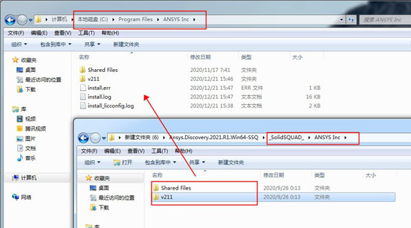 7、打开文件夹SolidSQUAD--ANSYS Inc,将里面的“Shared Files”,“v211”两个文件夹复制到软件根目录下默认路径【C:Program FilesANSYS Inc】;